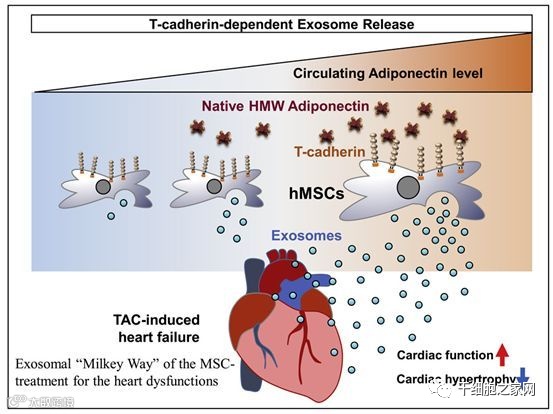 科学家向患有心力衰竭的小鼠注射MSC,可使它们左心室心脏功能得到显著的改善,这与循环中外泌体数量的增加有关。不过最重要的是,MSC治疗后的心脏功能可透过提高血液中脂缔素含量而得到更进一步的增强。