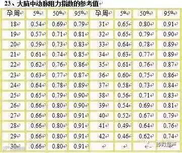 ② 胎儿大脑中动脉:RI多数为降低。通常<0.6,少数>0.8。