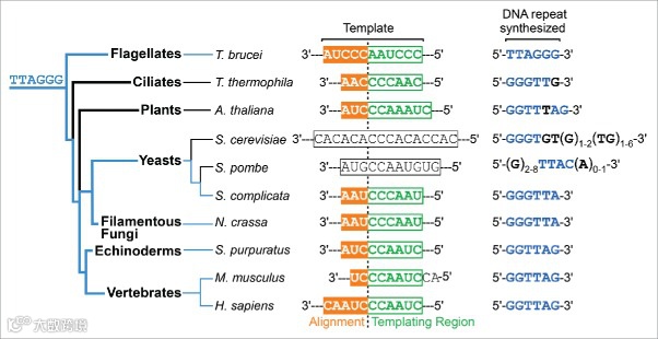 如下图所示,这种内在制动是指,端粒酶合成端粒依靠的RNA模板末端含有“GGTTAG”序列(终止密码子),可以停止DNA合成。当端粒酶重新开始下一次DNA合成时,该暂停信号仍然有效并限制了DNA的合成[1]。端粒酶的存在,能够修补DNA复制的缺陷,让端粒不会因为细胞分裂而损耗,使得细胞分裂的次数增加,凋亡延后。
