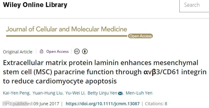 △ 细胞外基质蛋白层粘连蛋白通过αvβ3/ CD61整合素增强间充质干细胞(MSC)旁分泌功能,以减少心肌细胞凋亡
