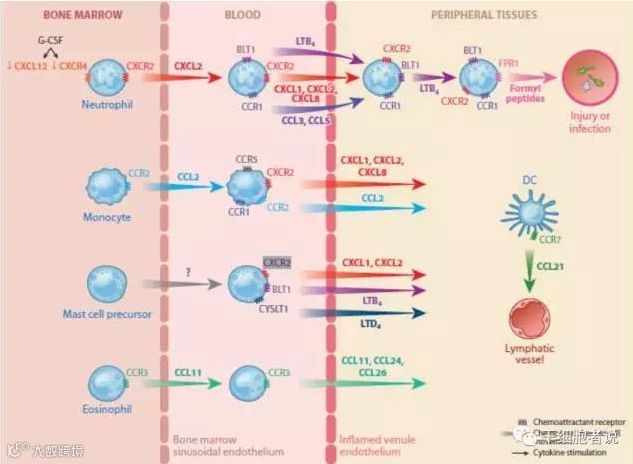 图注:炎症过程中骨髓,血液和周边组织之间的趋化因子交流。[4]