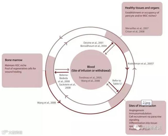 图注:间充质干细胞在不同的解剖位置发挥着不同的功能。炎症反应包含创伤、慢性炎症反应(如移植物抗宿主病)和肿瘤等。[2]