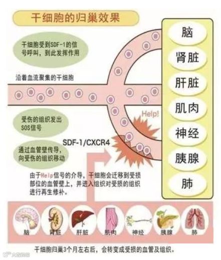 那就不得不提干细胞的一个重要特性,那就是细胞的“GPS导航”——干细胞的归巢性在起着决定作用。哪里有损伤,移植的干细胞就往哪里迁移,类似于红十字会,哪里有疾病,哪里就有他的身影。及时修复受损的细胞,同时激活休眠中的干细胞。