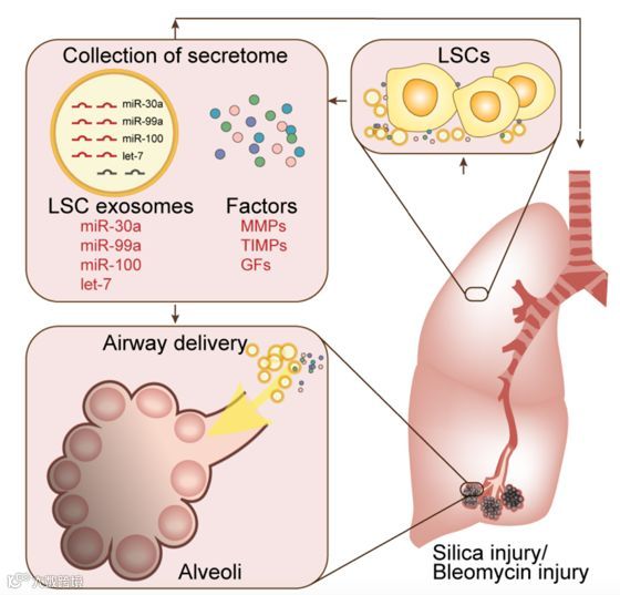 程柯课题组思路是这样的:首先,建立了肺纤维化和炎症模型;随后对比了肺球干细胞分泌组(LSC-Sec)/外泌体组(LSC-Exo)与MSCs的分泌组/外泌体的治疗效果。给药方式是:雾化吸入肺部。