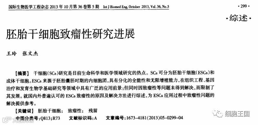 上海交通大学组织工程国家工程研究中心王玲,张文杰2013年在Int Biomed Eng(October 2013,Vol.36,No.5)发表综述《胚胎干细胞致瘤性研究进展》,对胚胎干细胞致瘤性及其原因进行了深入分析。