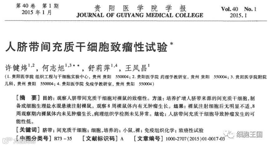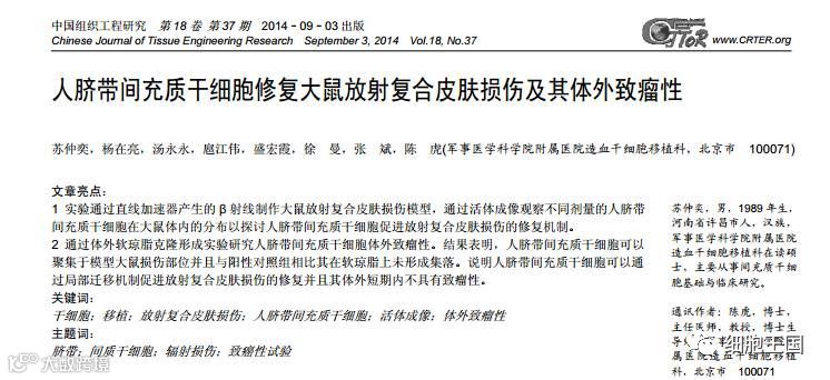 中国军事医学科学院附属医院造血干细胞移植科苏仲奕、陈虎等2014年在《中国组织工程研究》刊发文章《人脐带间充质干细胞修复大鼠放射复合皮肤损伤及其体外致瘤性》,在损伤模型中,人脐带间充质干细胞可以通过局部迁移机制促进放射复合皮肤损伤的修复,体外软琼脂克隆形成实验证明,其短期内不具有致瘤性。