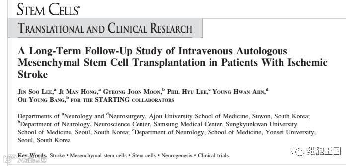 韩国的干细胞研究走在世界前列。2010年韩国Departments of Neurology and Neurosurgery/Ajou University School of Medicine的Jin Soo Lee等发表间充质干细胞移植治疗缺血性中风患者的长期观察和研究报告。结果显示,实验组患者相比对照组接受间充质干细胞治疗在生存时间、mRS评分等方面明显获益,研究未发现有致瘤性风险。