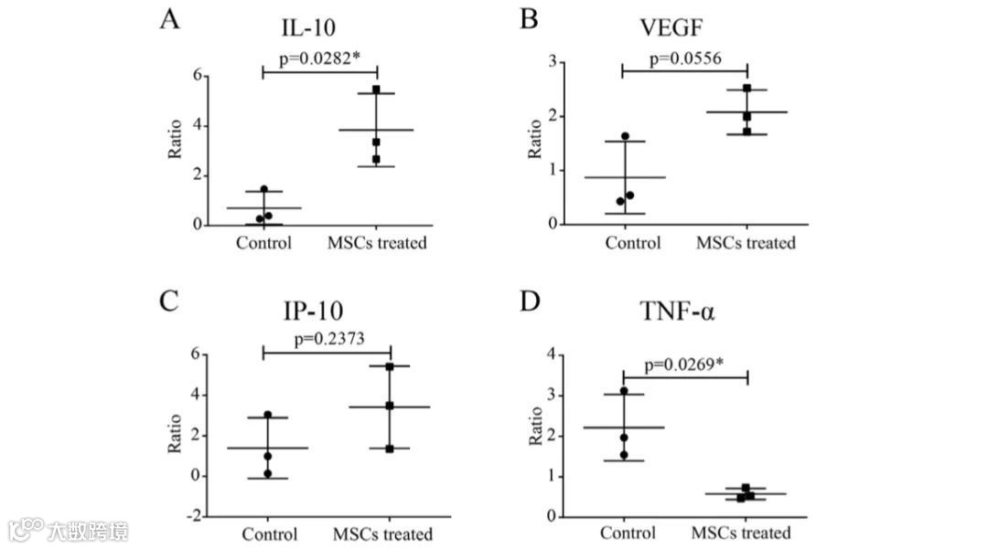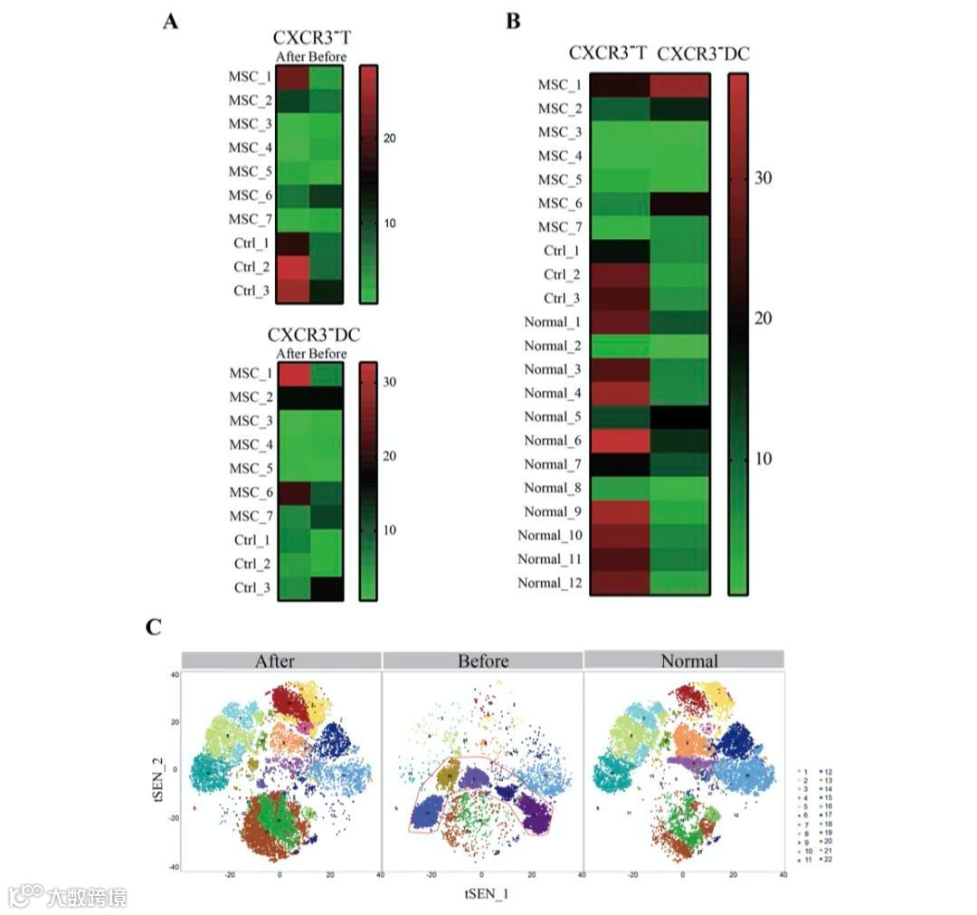 研究者通过质谱流式分析发现间充质干细胞移植后,导致细胞因子风暴的元凶——过度活化的免疫细胞CXCR3 + CD4 + T细胞、CXCR3 + CD8 + T细胞和CXCR3 + NK细胞在3-6天内消失。另外,CD14 + CD11c + CD11bmid调控的树突状细胞数量急剧增加。另外,与安慰剂对照组相比,MSC治疗组的TNF-α水平显着降低而IL-10水平升高。以上结果在重症患者中尤其显著。