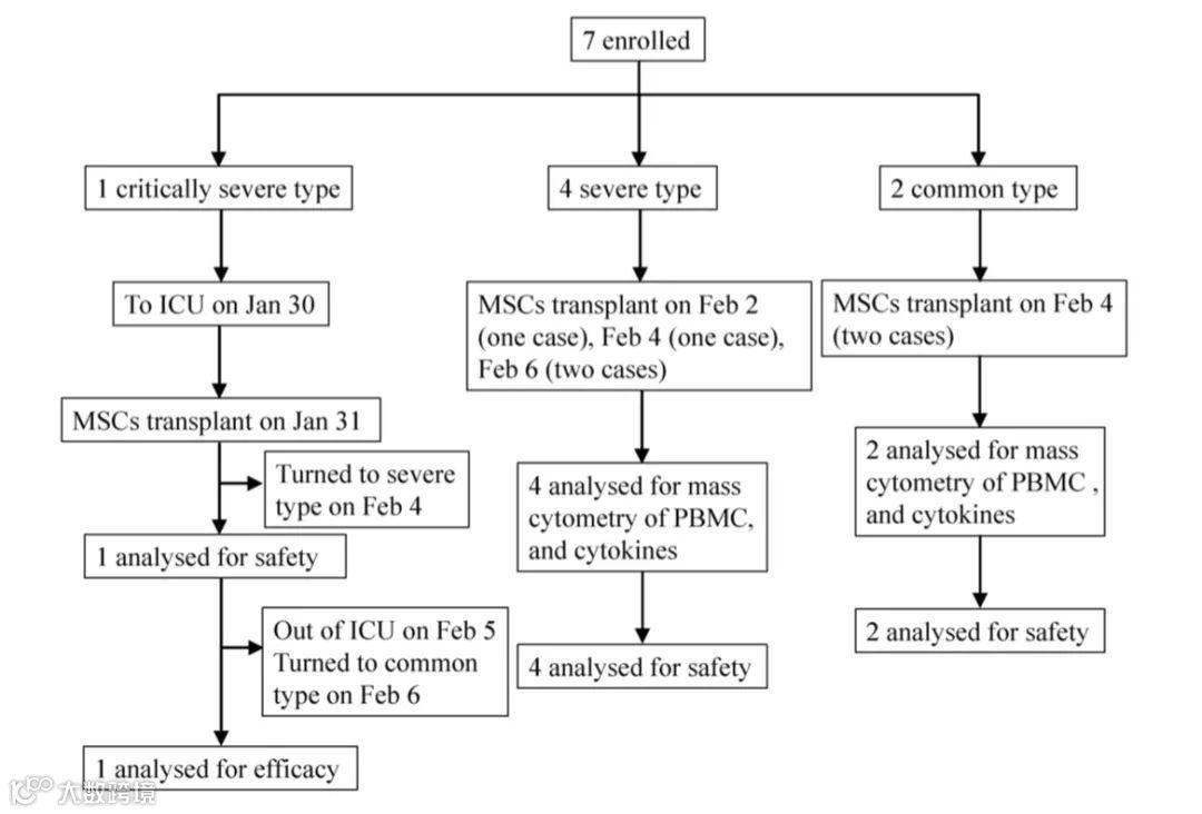 在2020年1月23日至2月16日期间,研究者共征集了首都医科大学附属北京安佑医院的7名COVID-19患者,其中包括1名危重症患者、4名重症患者和2名轻症患者,探究间充质干细胞移植后14天内,患者的免疫系统和炎症系统功能变化,以及副作用的发生情况。