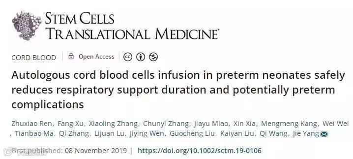 可喜的是,近些年来脐带血医学事业的发展为早产并发症患儿的治疗提供了新思路。广东省妇幼保健院杨杰、任竹潇、许芳等研究者曾通过一项非随机前瞻性临床试验发现,自体脐血单个核细胞输注可以减少早产儿呼吸支持时间,具有降低早产并发症发生率的潜力。日前,该研究结果发表在《干细胞转化医学》上。