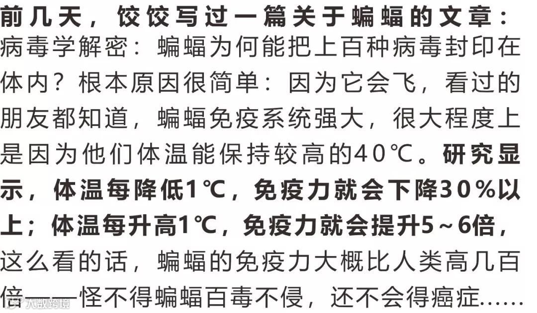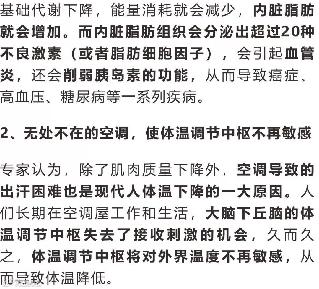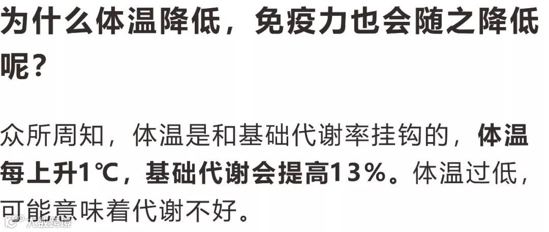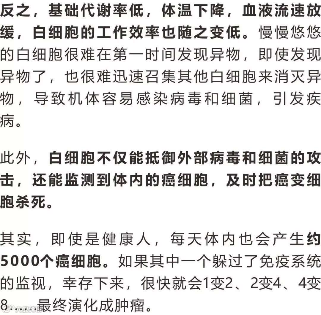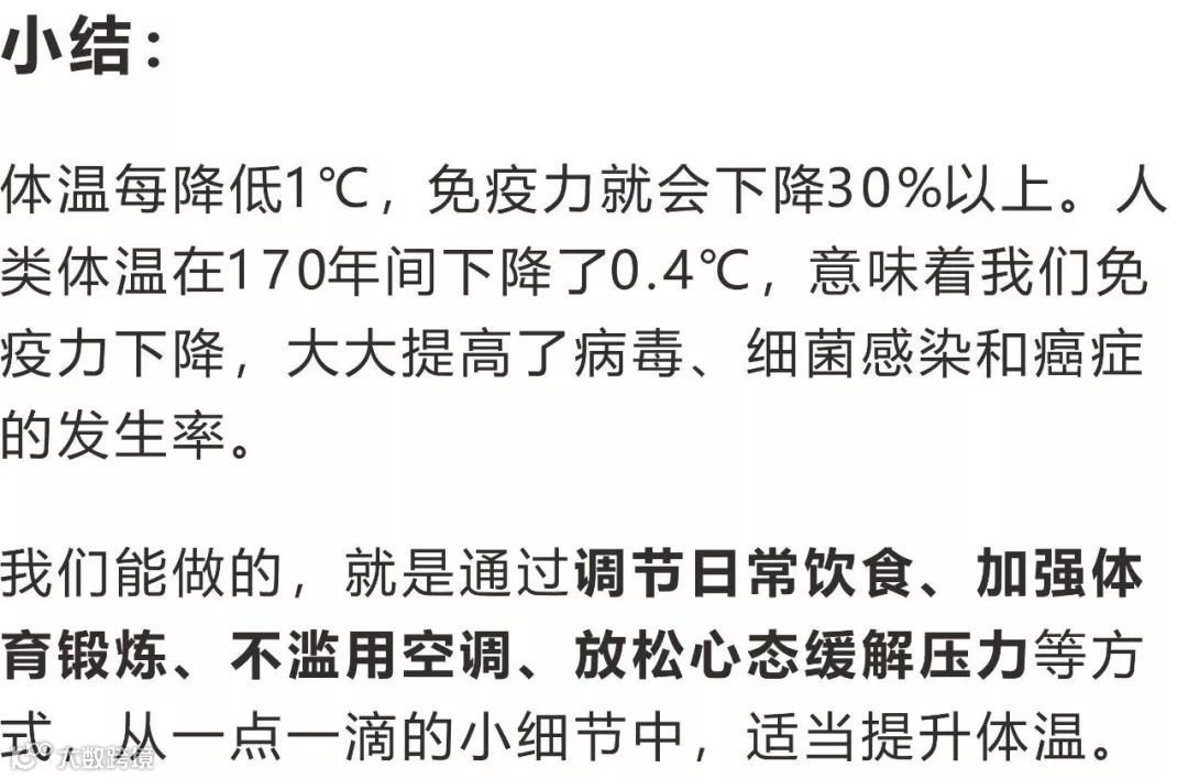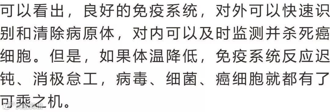 据科学家推算,如果体温下降1℃,免疫力降低30%,则每天免疫系统可能会漏掉近1500个癌细胞,任其疯狂繁殖。