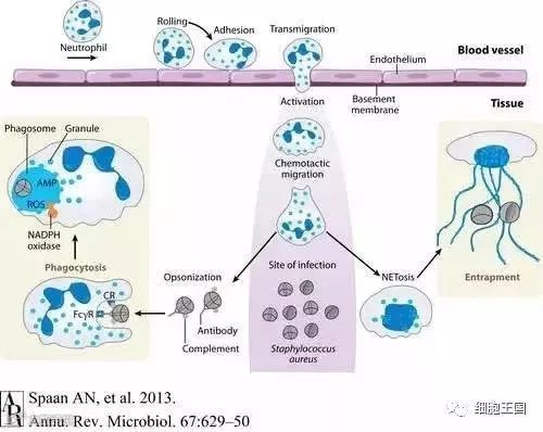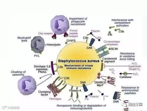 金黄色葡萄球菌简直就是中性粒细胞的克星,它进入人体后会阻止补体的激活,增大免疫细胞识别的难度;它会分泌小分子阻止信号分子招募中性粒细胞(小喇叭广播开饭的时候谁突然把电掐了);它会干扰免疫反应,特异抗体的分泌会减少(不给筷子怎么让人吃);它会直接分泌毒素杀死中性粒细胞;它会穿上防弹衣不怕中性粒细胞释放的抗菌肽和自由基。