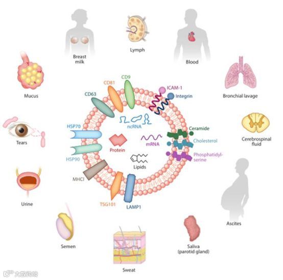 几乎所有类型的细胞都可以分泌外泌体,同时外泌体也广泛存在于体液中,包括血液、眼泪、尿液、唾液、乳汁、腹水等。目前研究发现外泌体中富含核酸(microRNA、lncRNA、circRNA、mRNA、tRNA等)、蛋白、胆固醇等。外泌体的表面marker主要有CD63、CD81、CD9、TSG101、HSP27等。