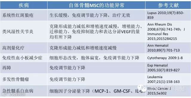 第七,何种情况适合自体MSC治疗。MSC存在于机体多个组织器官,包括骨髓、脂肪、胸腺、外周血等。人体有年龄,组织器官有年龄,干细胞同样有年龄。年龄大的MSC的增长速度明显下降[35, 36]。年龄大的MSC在体外培养时,细胞的胞体比年青的要大很多[36,37]。而细胞胞体的增大与细胞衰老密切相关[38]。有证明表面衰老的MSC有三个方面的改变:品质下降、分化/再生能力衰减、迁移能力减弱[39]。这部分内容的详细论述可参考本公众号《病人自体干细胞有功能缺陷,不适合自体移植治疗》。某种疾病的患者自身MSC会出现某种功能的缺陷(见下图4),这些功能的缺陷是否严重到影响疗效,这依然需要进一步的深入研究。