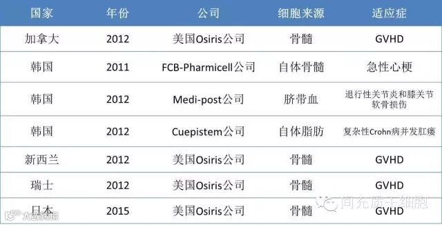 虽然多个随机对照临床试验证明MSC在临床应用的安全性(无致瘤性),虽然多个国家已经批准MSC上市(见下图1);而美国FDA没有批准上市,这可能导致了很多人对MSC的安全性依然有顾虑,其实美国FDA不批准Osiris公司的Prochymal(骨髓MSC)上市,不是出于安全性考虑,而是因为其治疗GVHD的III期临床试验结果达不到预期。