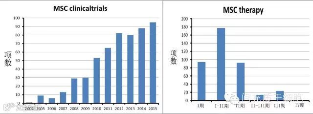 第六,适应症的选择。由于MSC广泛存在于人体,那么人体出现的所有疾病,是否都可以应用MSC来治疗?在clinicaltrials网站登记注册的MSC临床试验(I-III期)的病种或适应症有数十种(见下图3),其中不少已经发表了临床研究的结果。那么MSC治疗的适应症的选择依据是什么?MSC的干细胞生物学功能决定了MSC的疗效(治疗方案也很重要),因此,深入研究MSC的功能显得非常重要。早期认为MSC的分化功能适合用来治疗某种疾病,但是MSC的治疗机理更可能在于分泌细胞因子[29-34]。但是目前还没有数据或文章支持生物活性分子组合可以取代MSC来治疗疾病;而且MSC的一些优点是生物活性分子所不具有的,比如低免疫原性、趋化聚集到损伤的局部位置、与组织器官的细胞与细胞间的交流(cell-cell crosstalk)等。