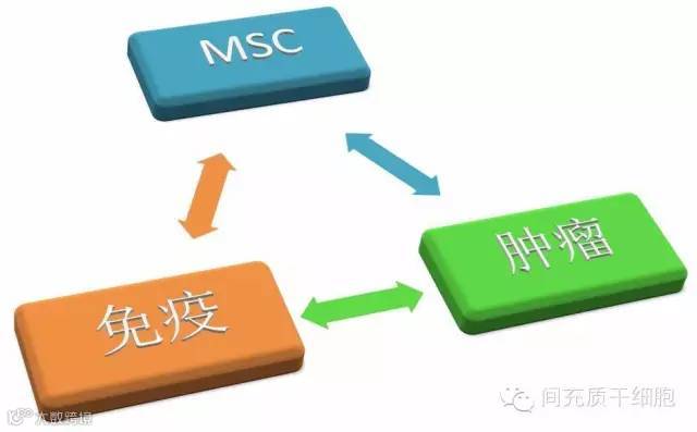 第一,MSC是人体所必需存在的一种细胞类型。目前尚未发现或证明肿瘤细胞来源于MSC,甚至有学者认为肿瘤干细胞不是来源于正常的干细胞[13, 14],那么可以认为自身体内的MSC不会癌变为肿瘤细胞或癌细胞。至于MSC是否促进肿瘤细胞的生长?如果没有免疫系统的存在,MSC分泌丰富的营养性细胞因子,促进肿瘤细胞生长的可能性极大。但是机体存在免疫系统的情况下,外源的MSC能否有促瘤作用?免疫系统、间充质干细胞、肿瘤细胞/癌细胞,这三者的关系需要深入研究(见下图2)。至于肿瘤患者能否应用MSC治疗的详细分析,请参考本公众号的文章《肿瘤患者能不能使用间充质干细胞?》和《MSC减少肿瘤患者放化疗的毒副作用》。