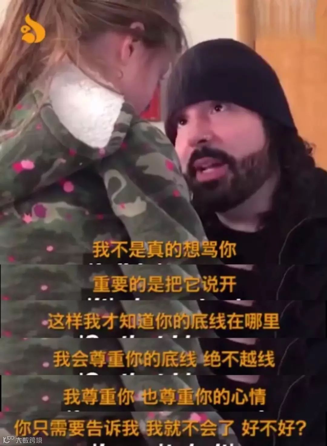 老爸接着告诉她:“我不是真的想骂你,你有时候也会这样说我,我有时不介意,有时也会生气,最重要的是把话说开,让我知道你的底线在哪里,我会尊重你的的底线,绝不越线。”