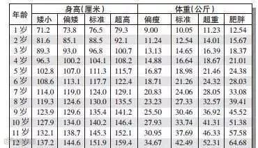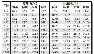 0-12岁男孩身高、体重表