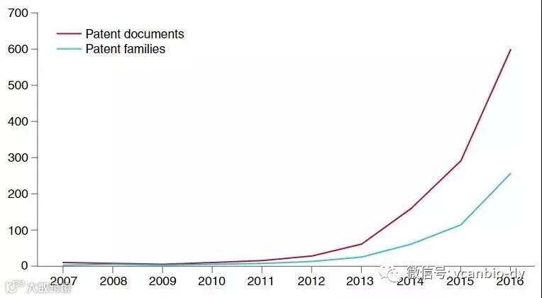 分析显示,2013年CAR-T细胞专利申请起飞,2013年60件申请(25个专利家族)的CAR-T细胞相关发明专利申请量增加,2016年增加到597件(255个家族)。