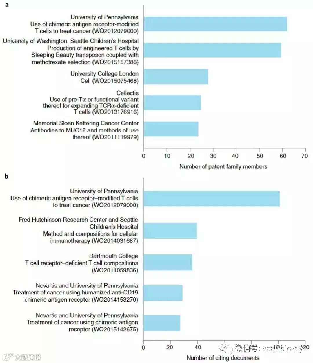 CAR-T专利价值分析。a. 家族成员最多的前五项CAR-T专利; b. 被引用次数最多的前五项CAR-T专利(图片来源:Nature Biotechnology)