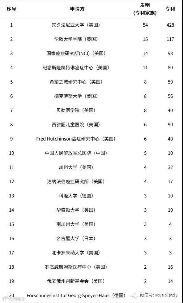 CAR-T专利申请大学/研究中心排名