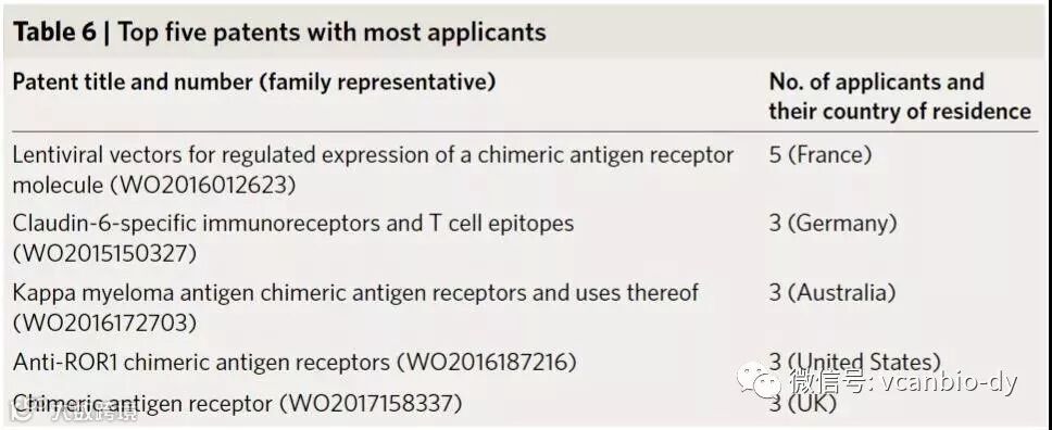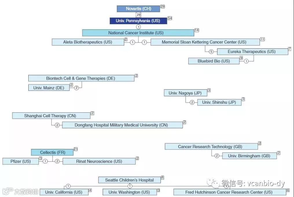 来自宾夕法尼亚大学的专利“使用嵌合抗原受体修饰的T细胞来治疗癌症”(WO2012079000)不仅是家族成员最多,而且被引用最多。
