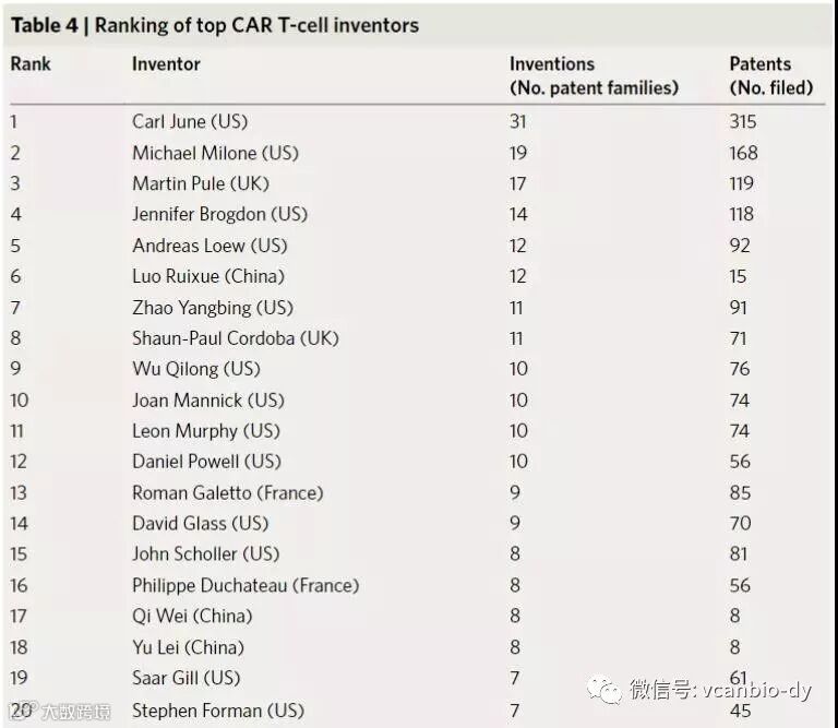 CAR-T专利发明人员排名