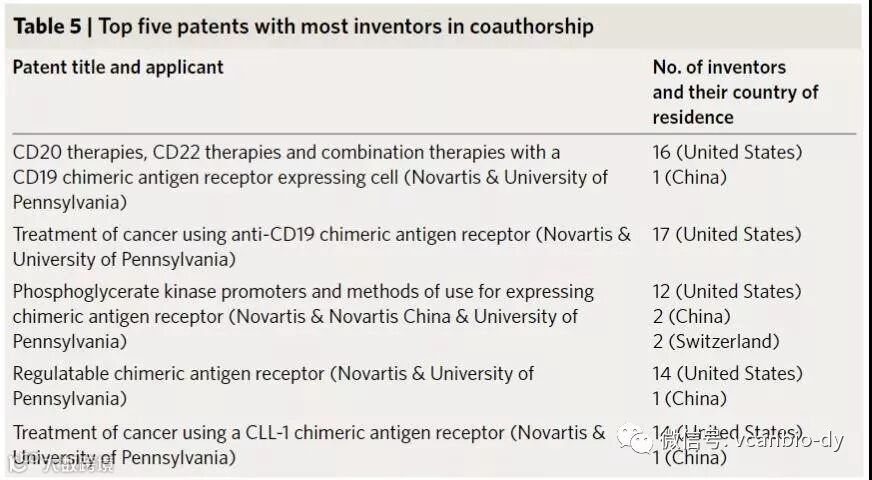 分析显示,发明人最多的前五项CAR-T细胞专利均由宾夕法尼亚大学与诺华共同拥有。大多数发明人或研究人员都是美国居民,因此作者认为可以假设大部分研究都是在宾夕法尼亚大学完成的。