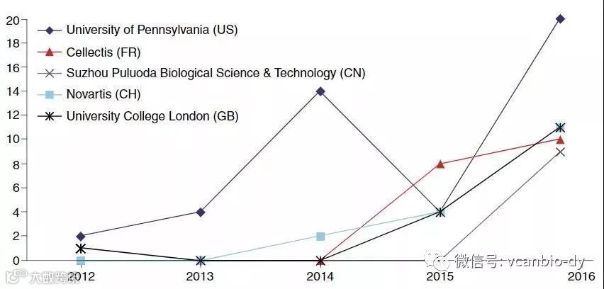 过去几年里,通过分析上述的5个主要参与者的专利发现:除了宾夕法尼亚大学之外,大多数都表现出专利申请的不断增长,宾大在2015年有所下降但之后出现反弹。