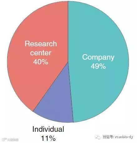 所有CAR-T细胞相关专利中近一半是由公司提交的,其次是研究中心 - 大多数是大学、研究机构和医院。一些专利是由个人提交的,在大多数情况下是与研究中心有关但拥有该专利100%所有权的研究人员。