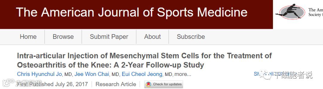 2017年10月,《美国运动医学杂志》刊发了Chris Hyunchul Jo 等韩国学者的一篇文章。结果表明,在2年时间内,关节腔注射自体脂肪组织来源的间充质干细胞治疗膝关节炎安全、有效。