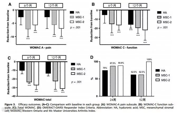 在12个月的随访期间,未发生严重不良事件。从结果来看,无论是单剂量还是双剂量治疗,MSCs治疗组都要优于HA对照组。
