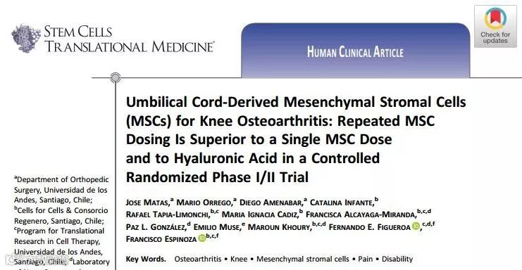 近日,智利的研究人员Francisco Espinoza等在《干细胞转化医学》上发表了一项UC-MSCs治疗膝关节炎 I/II 期随机对照临床试验(NCT02580695),临床试验结果显示,多剂量MSCs治疗效果优于单剂量或补充透明质酸(HA)。