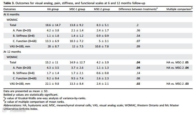 从WOMAC-A 疼痛分量表评分看,在第12个月时,与透明质酸对照组相比,双剂量MSCs治疗组的下降到显著较低的疼痛水平。从VAS评分评分看,双剂量MSCs治疗组VAS评分显著低于透明质酸对照组。从总WOMAC评分看,双剂量MSCs治疗组在第12个月时低于透明质酸对照组。
