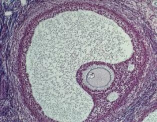 在前颗粒细胞经过大约9个月的分化成为立方形细胞之后,始基卵泡正式成长为初级卵泡(primary follicle)。初级卵泡不断增殖使得细胞层数由2层变成了6~8层,就变成了次级卵泡(secondary follicle)。