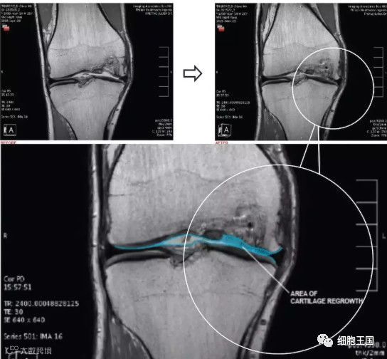 上图a为治疗前关节镜检查结果,可以看出软骨存在缺损。图b为脂肪间充质干细胞联合PRP治疗,图c为治疗后结果,软骨得到了修复。