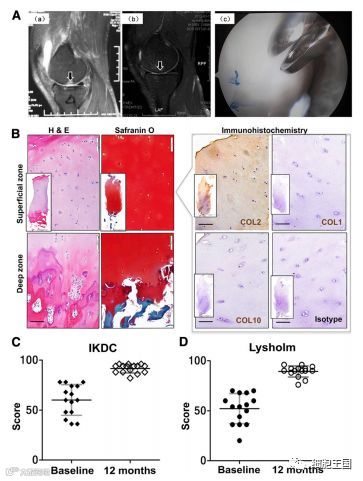 2016年,曾在《干细胞转换医学杂志STEM CELLS TRANSLATIONAL MEDICINE》上报道过,在中外学者共同参与的一项研究中,用人自身来源的软骨细胞结合生物胶原支架,治疗软骨缺损,治疗后随访12个月全部患者的临床评分得到了提高,功能得到改善,疼痛得到缓解。