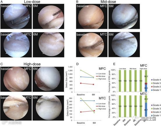 在注射AD MSCs之前和6个月后关节镜检查显示出,关节腔内注射脂肪间充质干细胞(AD MSCs)后内髁和股骨髁关节软骨再生,再生软骨呈光滑白色,表面光滑,无松动体、肥大或钙化异常。