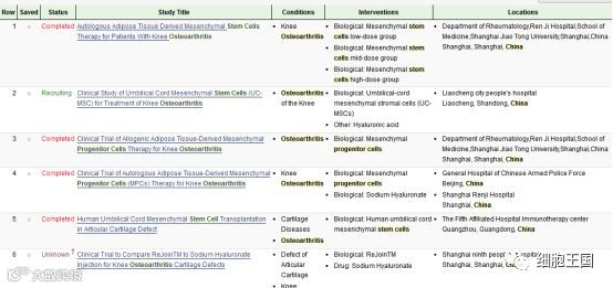 在国内,对于干细胞治疗骨关节炎的研究也正如火如荼的开展,在clinicaltrials.gov网站目前注册的研究有6项,其中4项针对间充质干细胞治疗该病的研究(1项脐带间充质干细胞、3项脂肪间充质干细胞)已经完成,1项(脐带间充质干细胞)处在招募状态。在已完成的研究结果来看,将间充质干细胞治疗用于骨关节炎疾病的研究中显效率较高,在未来极具取代传统疗法的潜力。