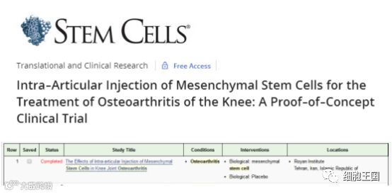 位于伊朗德黑兰市的Royan研究所是该国干细胞研究的领先中心。 迄今已有65个干细胞研究临床试验。该研究所在一项关节腔内注射间充质干细胞治疗膝关节骨性关节炎的试验中,招募了18名膝关节骨性关节炎患者,并将间充质干细胞注射到病人的膝关节中。结果表明,关节腔内注射间充质干细胞,整个治疗过程中无不良反映,间充质干细胞可改善膝关节功能及疼痛,并可通过关节软骨透明样再生减少软骨缺损。