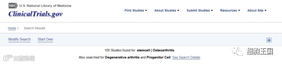 小编以“Osteoarthritis(骨关节炎)”和“stem cells (干细胞)”为关键词在美国国立卫生研究院注册的关节炎干细胞临床治疗研究已达105项之多,其中一部分已经完成了临床研究试验,以及安全性和有效性的初步评价。