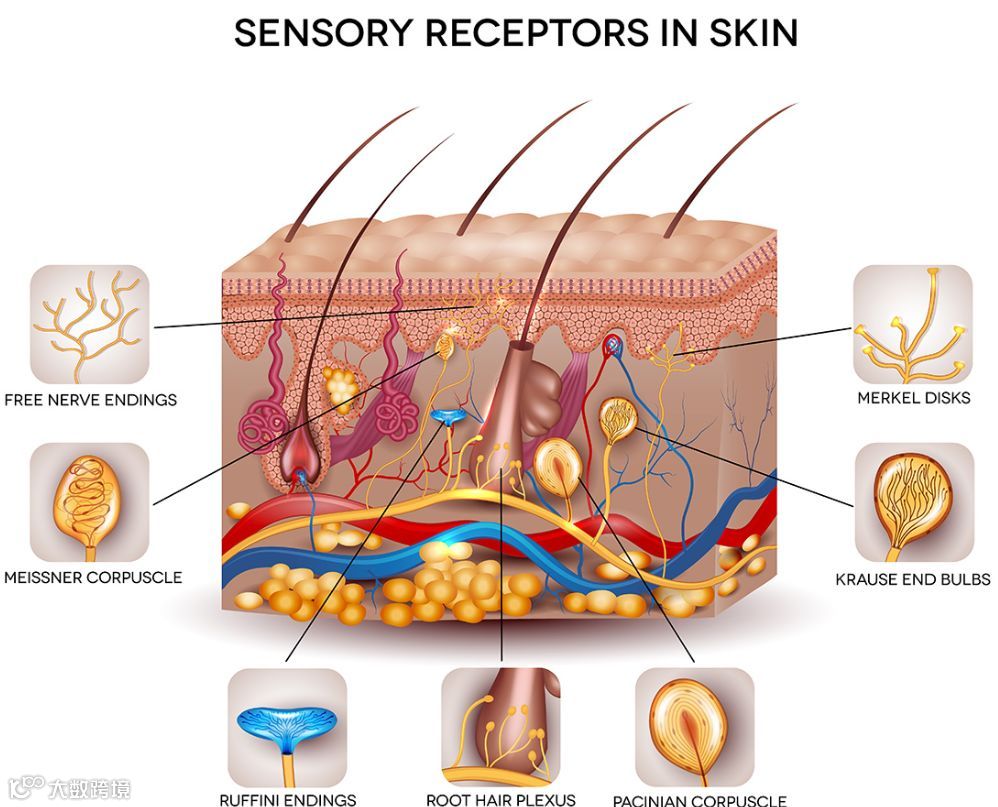 在表皮下层,占有大部分结构的是真皮层,厚度为0.2厘米左右,又可分为三层,即乳头层、乳头下层及网状层等,大部分由蛋白质所构成,此部分蛋白质是同胶原蛋白及弹性蛋白(elastin)组成,其他则是神经、毛细血管、汗腺及皮脂腺、淋巴管及毛根等组织构成。