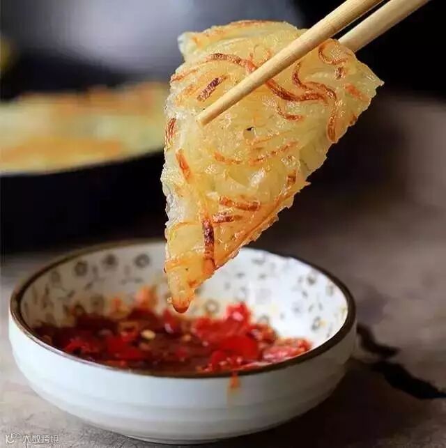 3.烙好的土豆饼切块蘸辣椒酱食用,简直美味~