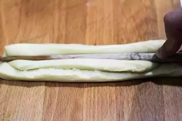 2.将面团整理成片状,像上图一样切成开,然后两片叠加,用筷子在中间按一条印。