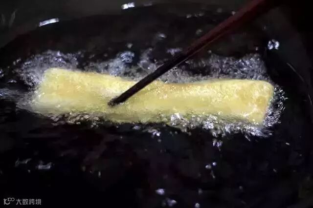 3.油锅烧到七成热,下油条坯子炸制,边炸边用筷子翻面。