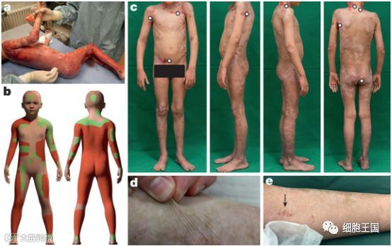 图c,男孩的转基因皮肤。图d,取活检的伤口正常愈合,没有像过去那样起一个大水疱。图e,即使揪起皮肤也不再担心弄伤男孩。图片来源:参考资料[2]