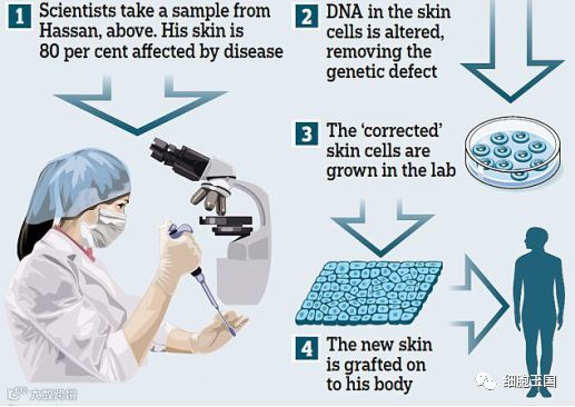 参与治疗的医生在实验室里培养生长出新的皮肤——特征是干细胞经过基因改造(将正常的LAMB3基因转进去),然后把这些转基因皮肤细胞在体外培养成一块块“皮肤拼布”,再贴回去。经过5周,所有的“人皮拼图”终于各归其位,覆盖了男孩80%的皮肤。治疗后没有出现排异反应,免疫系统接受了新皮肤。