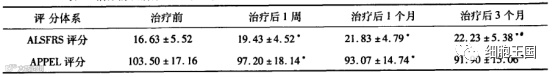 治疗前及治疗后I周、1个月、3个月的ALSFRS评分及APPEL评分变化。
