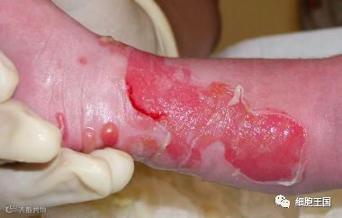 患者基因中一个叫LAMB3基因参与编码层黏连蛋白-332(laminin-332),这种蛋白在表皮与真皮之间形成一层“细胞外间质”,把表皮牢牢地“粘”在真皮之上,功能类似于“胶水”。若LAMB3基因出了问题,这种蛋白就失去了作用,失去了“胶水”的表皮无法黏附在真皮上,也无法保护娇嫩的真皮。